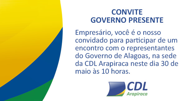 E você empresário é o nosso convidado para participar no dia 30 de maio às 10 horas (manhã) para um encontro com representantes do governo de Alagoas, na sede da CDL Arapiraca para falarmos de assuntos ligados ao nosso comércio.