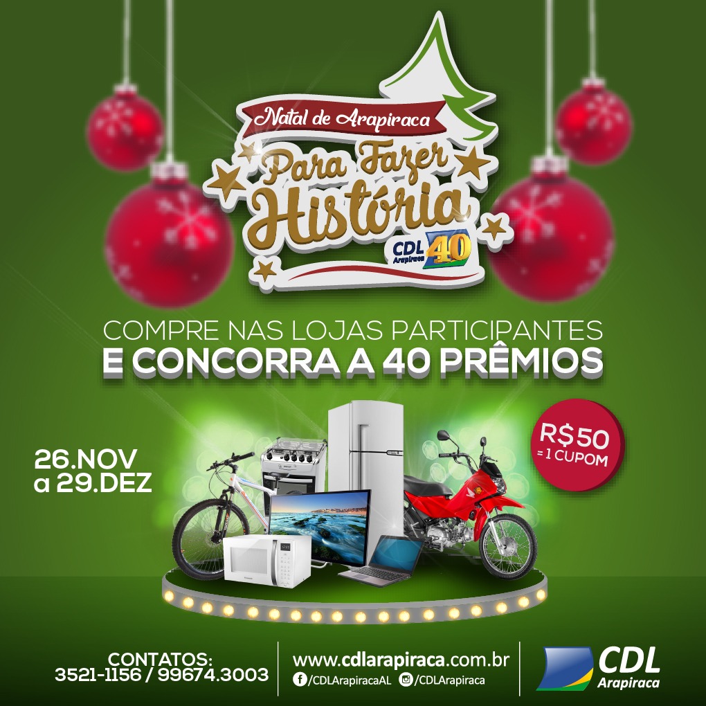Uma moto 0km, geladeiras, televisores e aparelhos celulares. Esses são apenas alguns dos prêmios que a Câmara de Dirigentes Lojistas (CDL) de Arapiraca estará sorteando em sua campanha de Natal.
