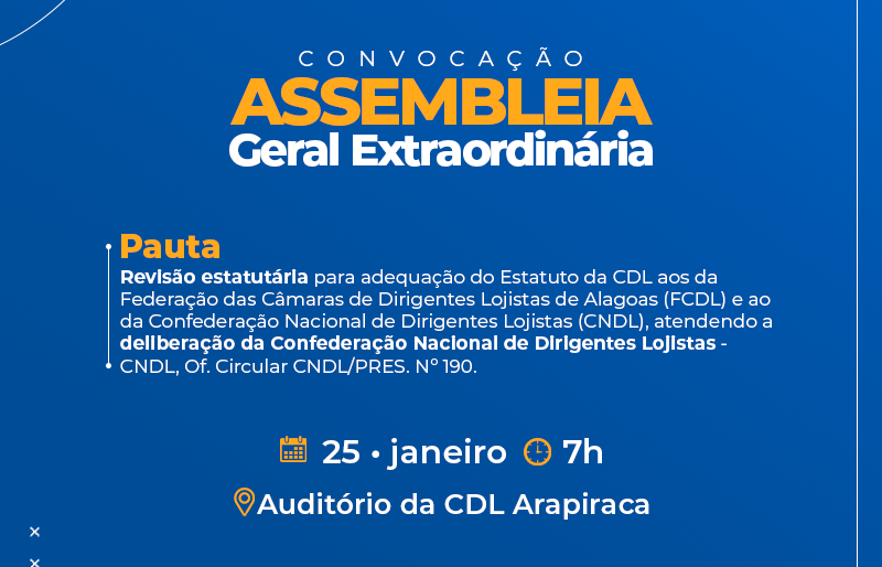 A Câmara de Dirigentes Lojista de Arapiraca, com sede nesta cidade, na Rua Domingos Correia 490, Bairro Centro, através do Presidente Antônio de Albuquerque Bento, de acordo com o Artigo 26, inciso I, CONVOCA através do presente edital, todos os Associados Efetivos, em dias com as suas atribuições legais, para Assembleia Geral Extraordinária, que será realizada no auditório da sede da CDL, às 07(sete) horas, do dia 25(vinte e cinco) de janeiro de 2023(dois mil e vinte e três), com a seguinte ordem do dia: